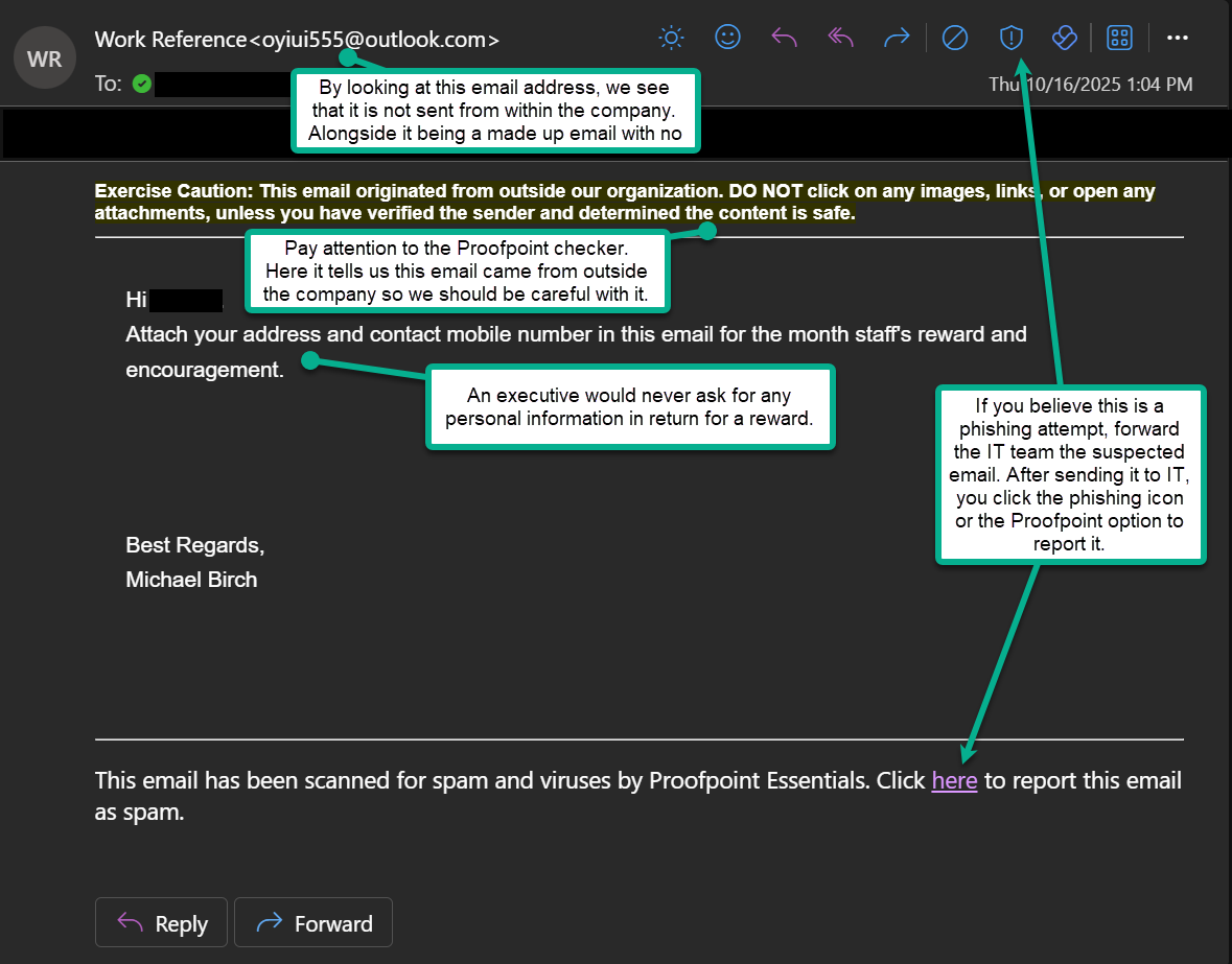 This phishing email impersonates the company’s CEO, asking staff to provide personal information for a supposed “staff reward.” The vague wording, lack of personalization, and request for personal data via email are classic signs of a Business Email Compromise (BEC) attempt.