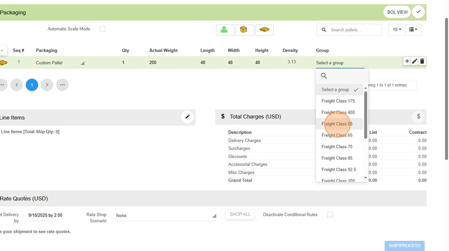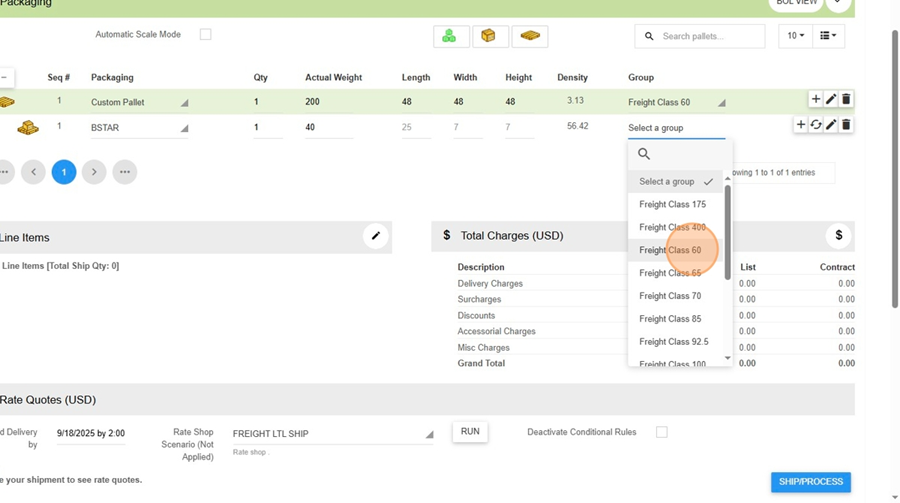 - If quoting for LTL (Less Than Truckload), select an LTL carrier (e.g., Old Dominion, FedEx Freight) to enable pallet entry.
