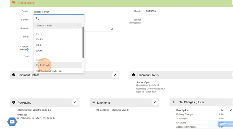 - For small parcel quotes, leave the carrier as “No Carrier Selected” or choose a parcel carrier.