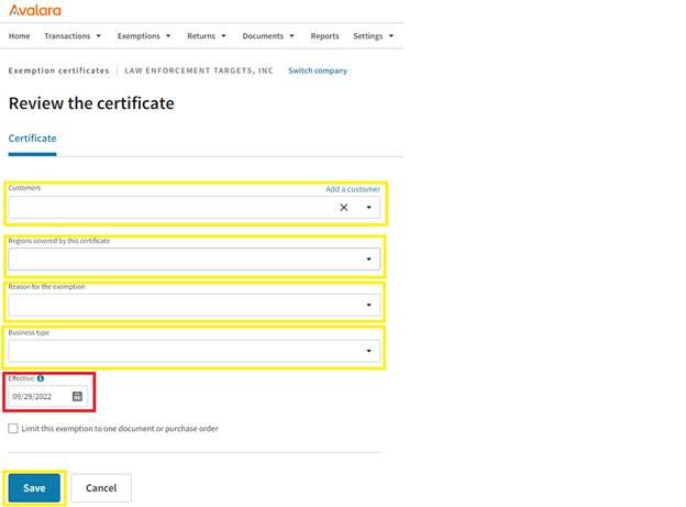 - Once all the required fields have been entered you will be able to click save to add the customer to Avalara.