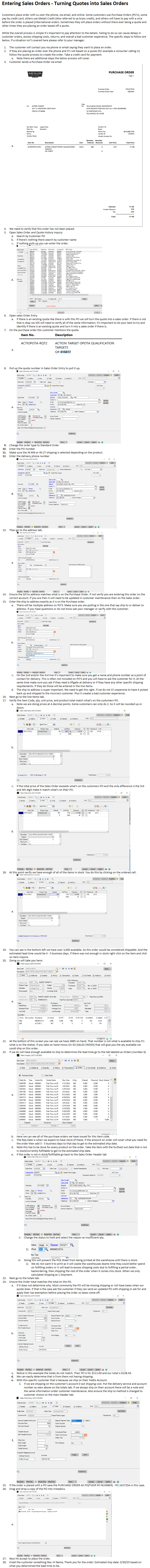 - If there is an existing quote like there is with this PO we will turn the quote into a sales order. If there is not that is okay we still will need to verify all of the same information. It's important to do your best to try and identify if there is an existing quote and turn it into a sales order if there is.